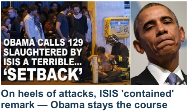 Three days after teams of Islamic State terrorists brazenly carried out raids across Paris that left 129 people dead, President Obama labeled the slaughter a "setback" in responding to questions about his policies.
